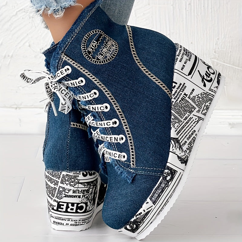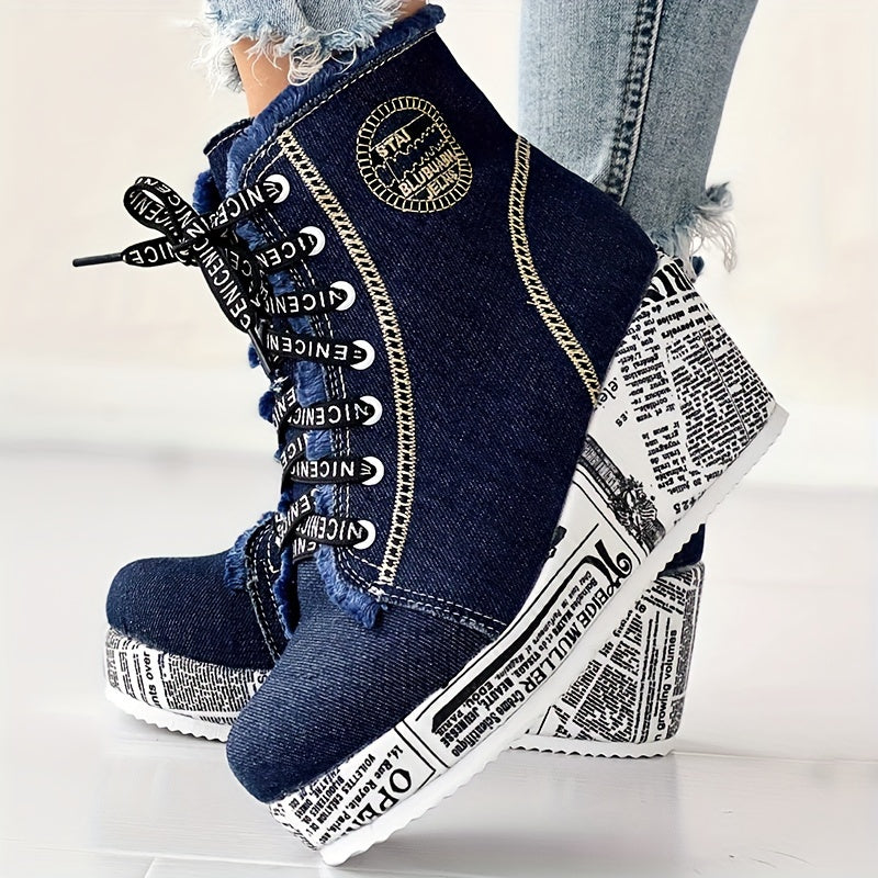 Crafted with a soft fabric upper and MD cushioned sole, they offer light flexibility and durability for all-day wear. The round toe design keeps the look versatile, while the heart-shaped laces add a romantic, fashion-forward touch. A chunky wedge heel enhances both height and stability, making these boots perfect for dressing up casual looks or adding flair to night-out outfits.