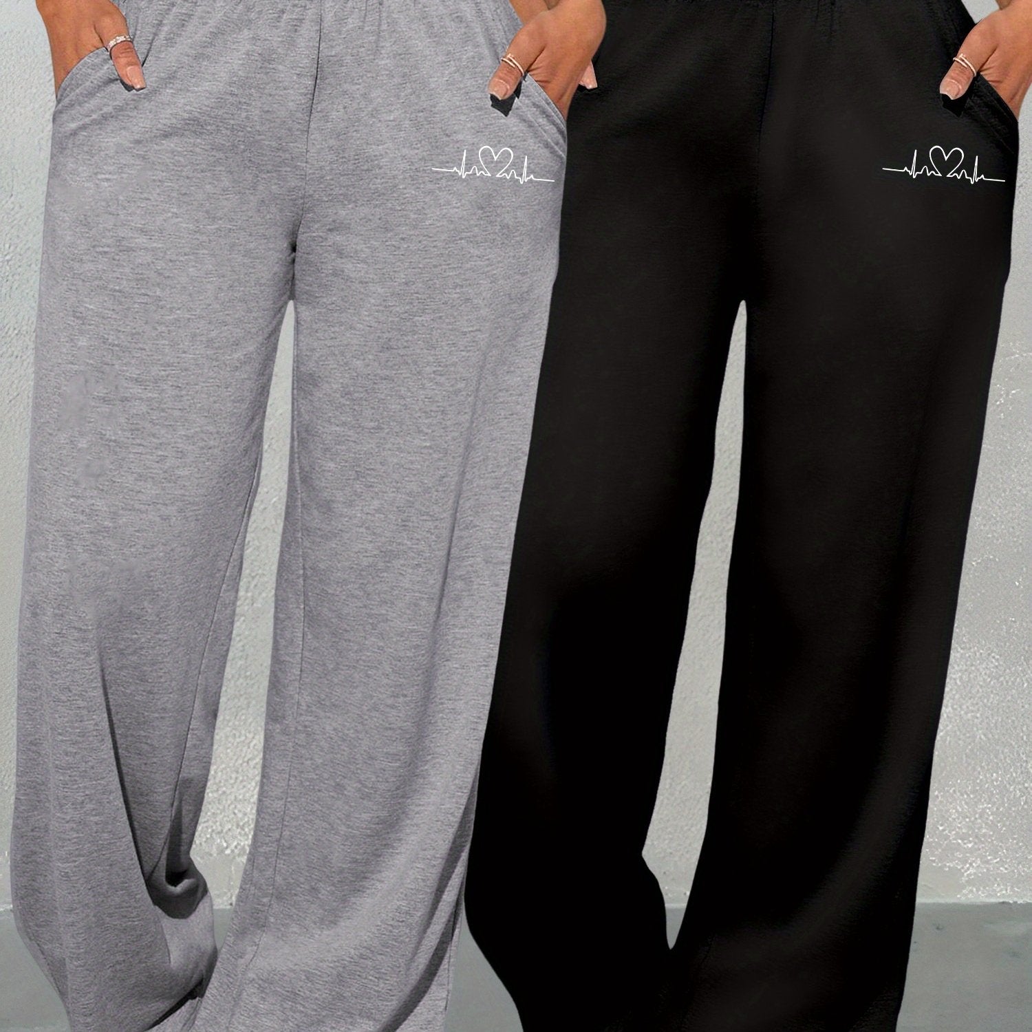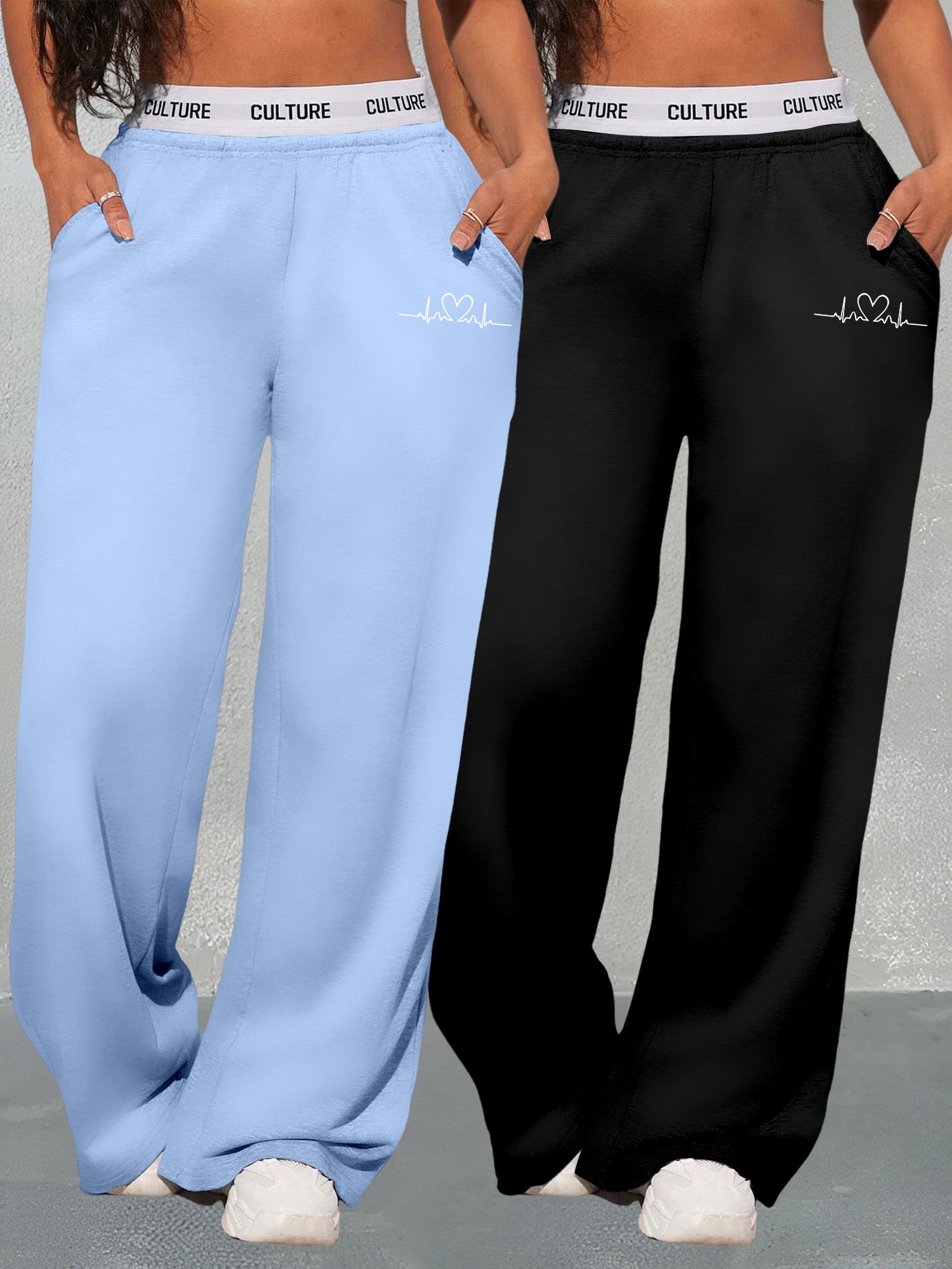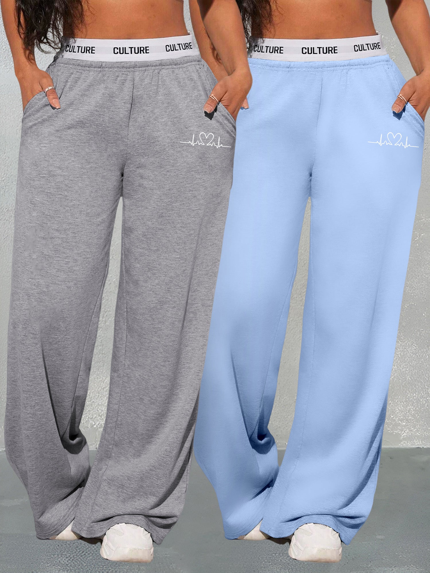 Women’s Geometric Love Print Two-Piece Set – Wide-Leg High-Waist Pants