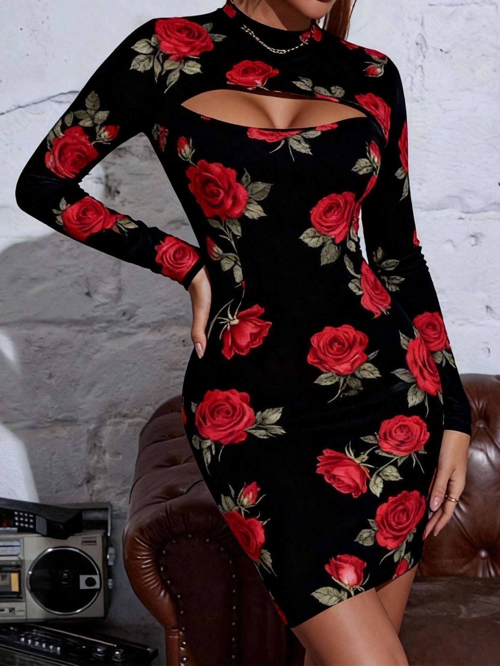 Rose Print Bodycon Midi Dress – Elegant Hollow Out Slim Fit Dress