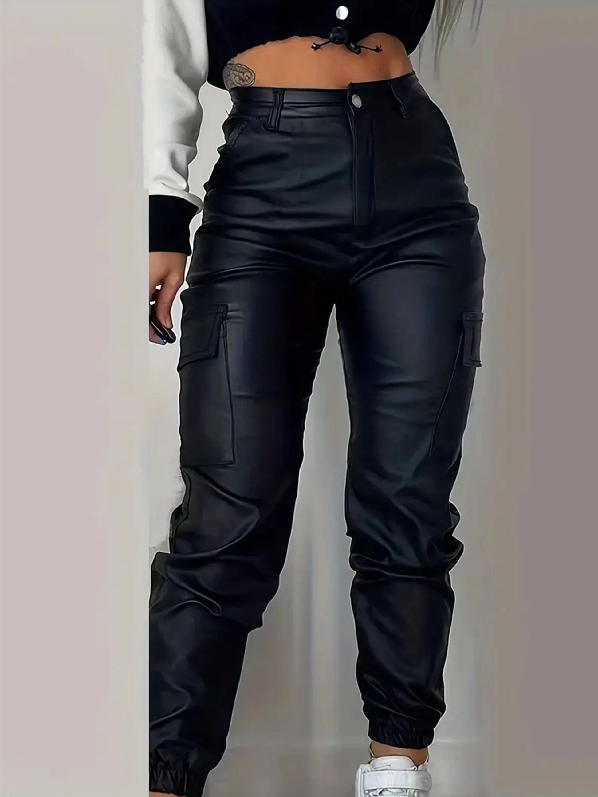 Women’s High-Rise Stretch Cargo Jeans – Black Glossy Denim Pants